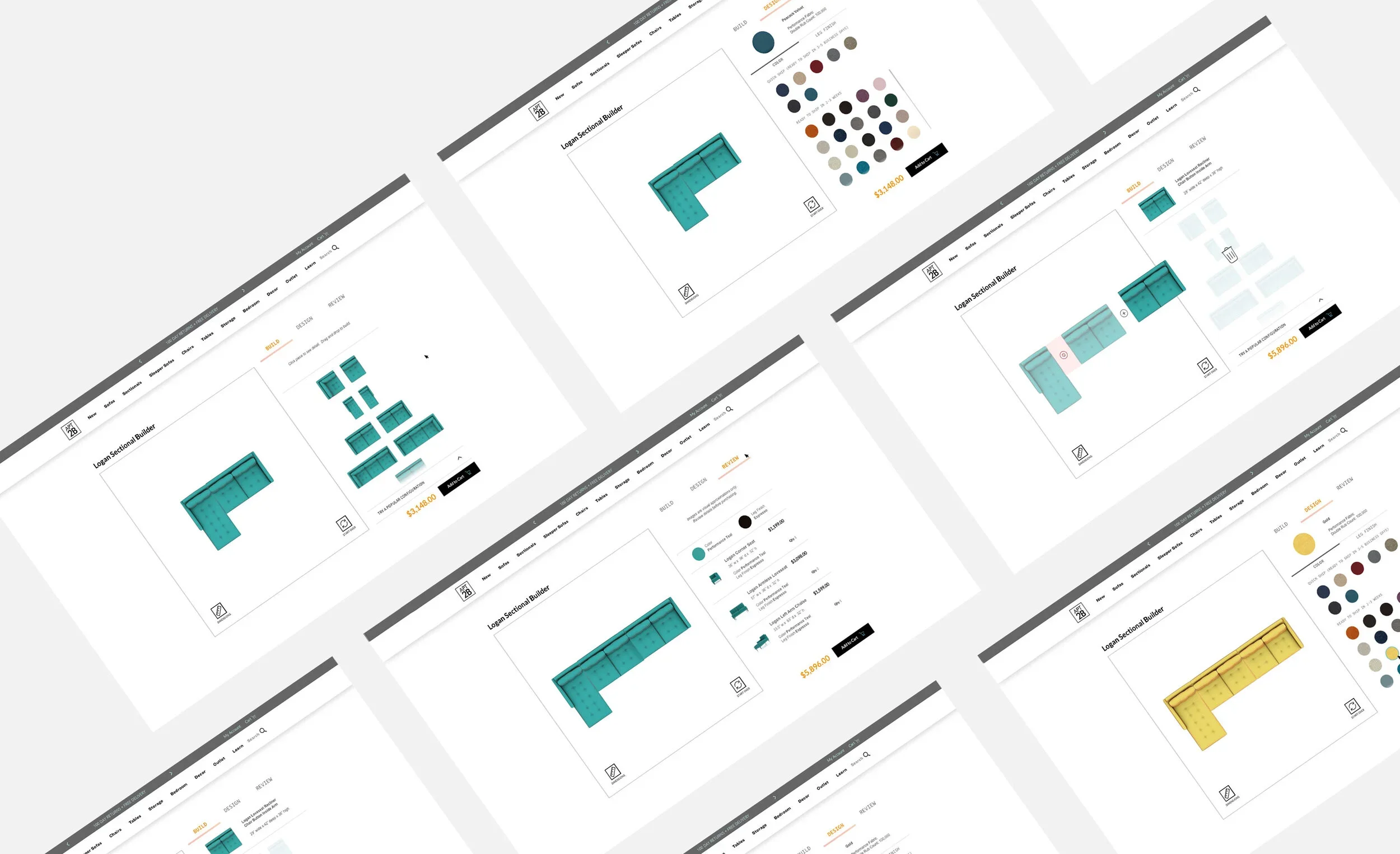 Outward is to implement a sectional builder tool within the Apt2B e-commerce site that allows Apt2B customers to build endless variations of sectional layouts and visualize fabrics in detail, for thousands of sectional styles, all in one place, while working around Shopify’s variant limit for our tool.
